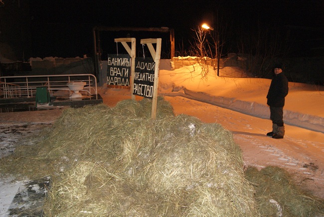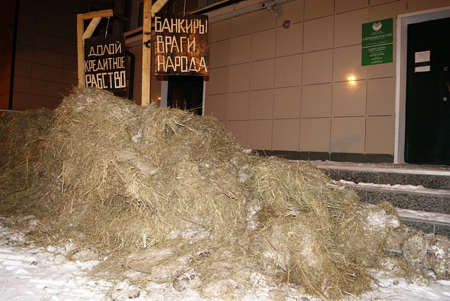 Кстати говоря, это событие, уже получившее название «навозный бунт», около отделения Сбербанка продлилось примерно час. В то время как фермер отвечал на вопросы нагрянувших интервьюеров, привлекая к себе внимание всех, кто проходил мимо, сотрудники банка не предпринимали попыток вызвать полицейских или как-то отделаться от предприимчивого заемщика.